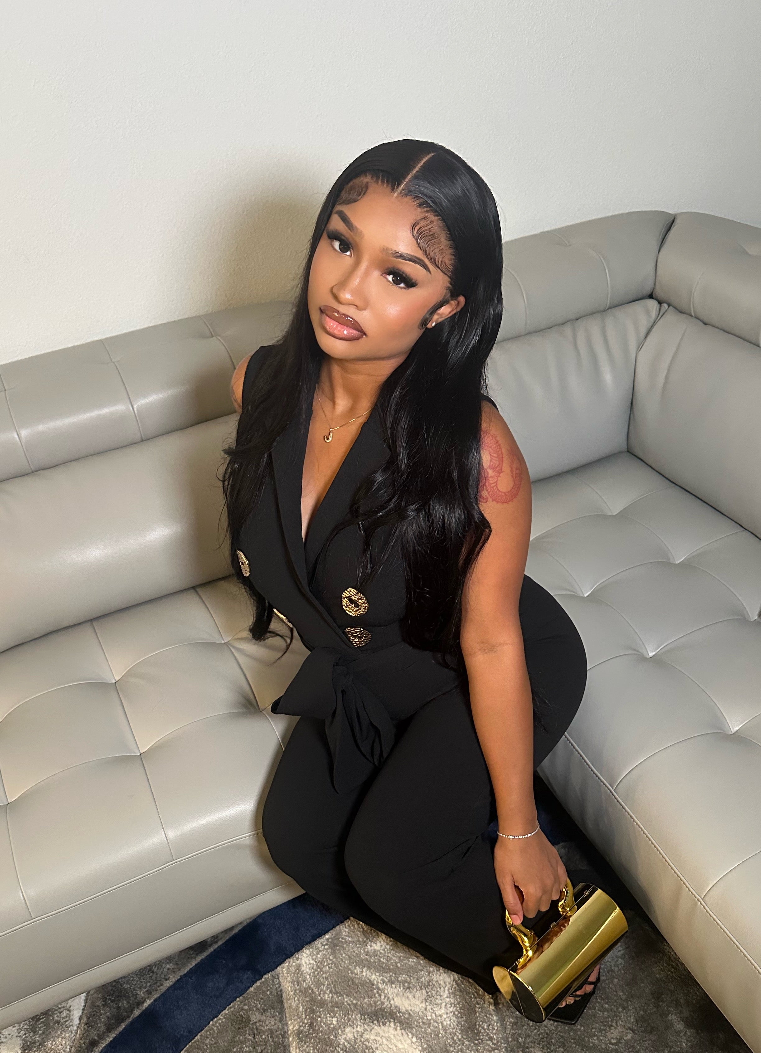 Black jumpsuit with gold belt. Classy and sophisticated Effortlessly elevate your style with the Jada Jumpsuit. Designed in a sleek black color, this jumpsuit features a stunning gold belt that adds a touch of elegance. Perfect for any occasion, this classy and sophisticated piece will make you feel confident and chic.