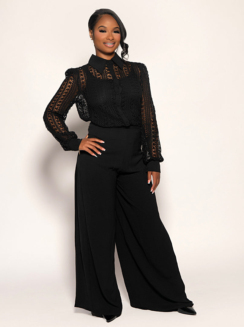 This look is the epitome of timeless elegance with a bold edge. The outfit features a black sheer lace blouse with intricate detailing and a structured collar, paired with a chic tie at the neckline for added sophistication. The top is completely sheer and does not include the black under shirt shown in the photo—allowing you to style it your way with a bralette or cami of your choice.